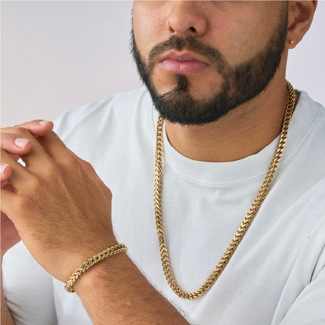 Combo franco, cadena y pulso.. Fundimos Oro 18k sobre titanio, forjando un blindaje con el color, brillo y textura del Oro Italiano. Su durabilidad es aprobada en laboratorio, por esto, nuestra garantía es de por vida y certificada.