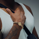 Fundimos Oro 18k sobre una aleación de titanio, forjando un blindaje con el color, brillo y textura del Oro Italiano.