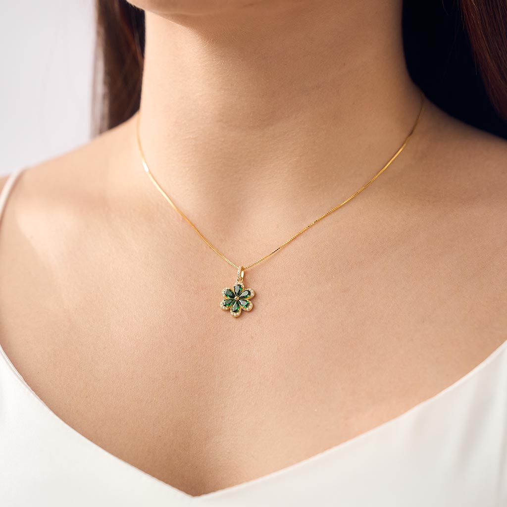 Elegancia y sofisticación en una sola pieza. Este collar está elaborado en plata de alta calidad bañada en oro, realzado por un dije con esmeraldas de laboratorio que destacan por su intenso color verde. Su diseño atemporal los convierte en el complemento ideal para cualquier ocasión, ofreciendo la resistencia de la plata, el brillo del oro y el resplandor de la esmeralda.
