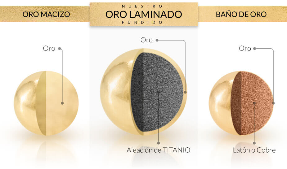 Fundimos Oro 18k sobre titanio, forjando un blindaje con el color, brillo y textura del Oro Italiano. Su durabilidad es aprobada en laboratorio, por esto, nuestra garantía es de por vida y certificada.