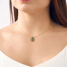 Elegancia y sofisticación en una sola pieza. Este collar está elaborado en plata de alta calidad bañada en oro, realzado por un dije con esmeraldas de laboratorio que destacan por su intenso color verde. Su diseño atemporal los convierte en el complemento ideal para cualquier ocasión, ofreciendo la resistencia de la plata, el brillo del oro y el resplandor de la esmeralda.