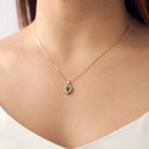 Elegancia y sofisticación en una sola pieza. Este collar está elaborado en plata de alta calidad bañada en oro, realzado por un dije con esmeraldas de laboratorio que destacan por su intenso color verde. Su diseño atemporal los convierte en el complemento ideal para cualquier ocasión, ofreciendo la resistencia de la plata, el brillo del oro y el resplandor de la esmeralda.