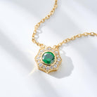 Elegancia y sofisticación en una sola pieza. Este collar está elaborado en plata de alta calidad bañada en oro, realzado por un dije con esmeraldas de laboratorio que destacan por su intenso color verde. Su diseño atemporal los convierte en el complemento ideal para cualquier ocasión, ofreciendo la resistencia de la plata, el brillo del oro y el resplandor de la esmeralda.