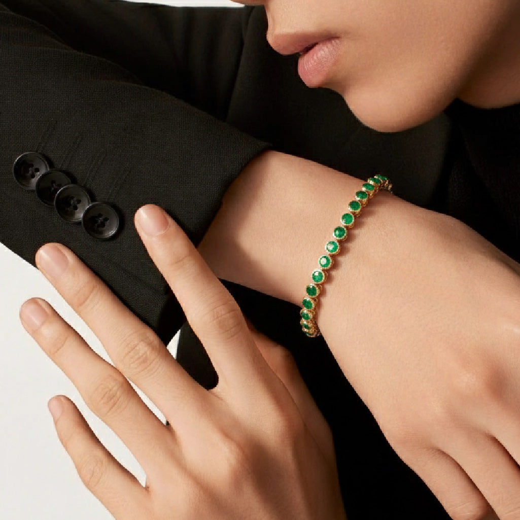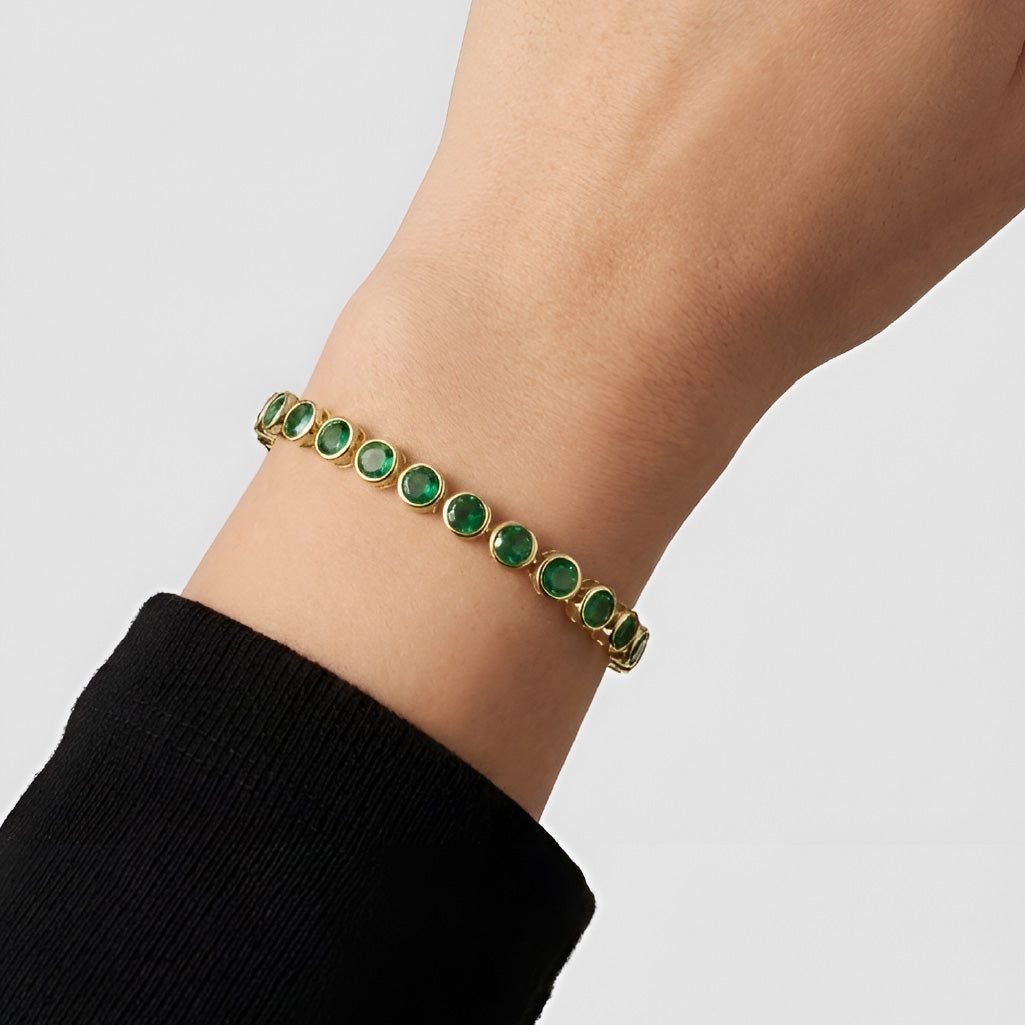 Elegancia y sofisticación en una sola pieza. Este pulso está elaborado en plata de alta calidad bañada en oro, realzados con esmeraldas de laboratorio que destacan por su intenso color verde. Su diseño atemporal los convierte en el complemento ideal para cualquier ocasión, ofreciendo la resistencia de la plata, el brillo del oro y el resplandor de la esmeralda.